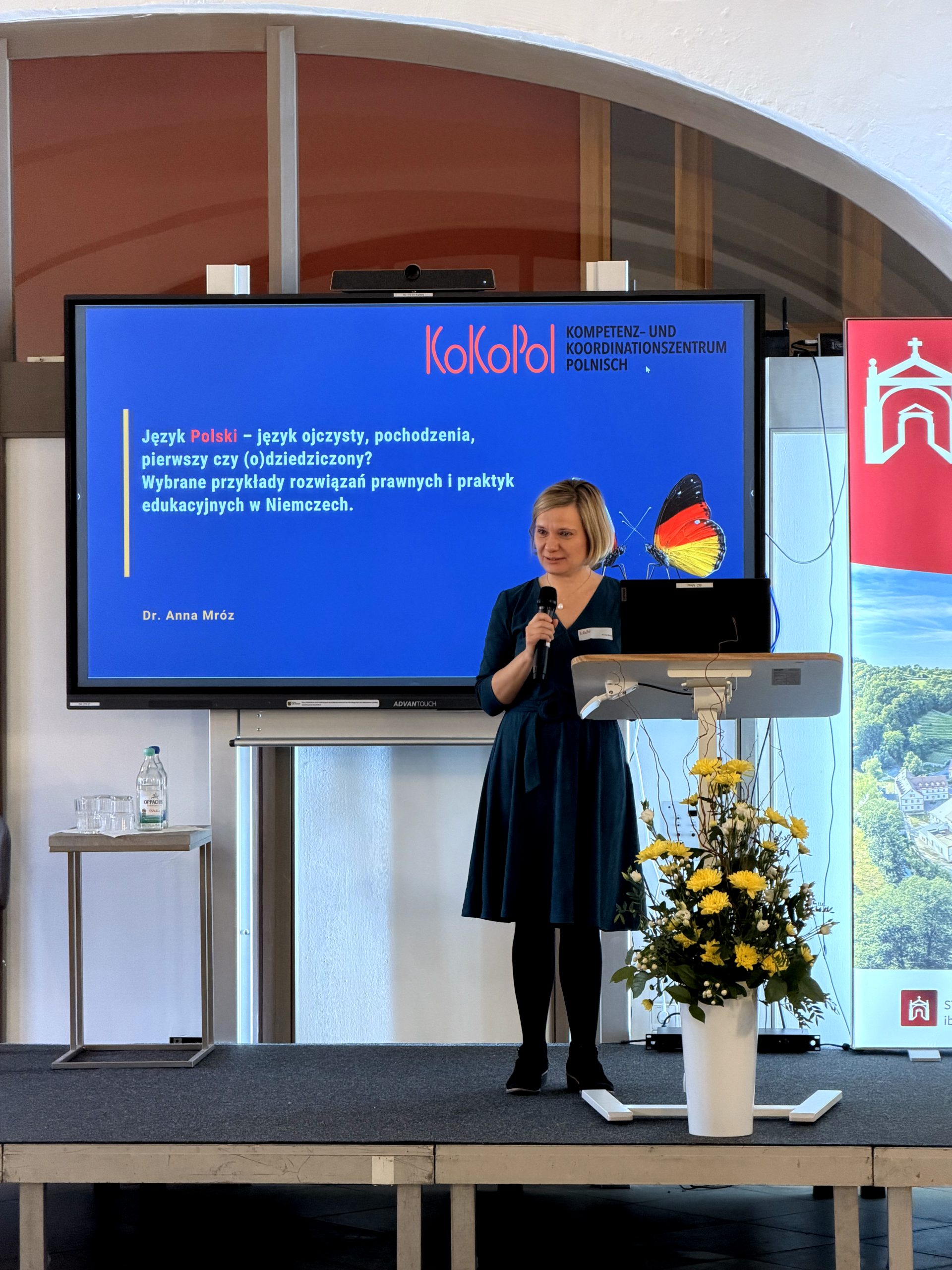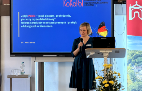 Den inhaltlichen Einstieg in das Forum gab Dr. Anna Mróz (KoKoPol) mit ihrem Vortrag „Polnisch – Muttersprache, Herkunftssprache, Erstsprache oder Herkunftssprache? Ausgewählte Beispiele zu rechtlichen Regelungen und pädagogischen Praktiken in Deutschland“. Bei dem Vortrag kam eine zentrale These zum Ausdruck: Die polnische Sprache hat die Chance, für die jungen Generationen zu einer Sprache der persönlichen Wahl zu werden. Dieser Prozess wird nicht nur durch eine emotionale Bindung an die Kultur bedingt, sondern auch durch ein positives Bild von Polen und die Pflege lebendiger Beziehungen zum Land. Besondere Aufmerksamkeit lag auf der Analyse der formal-rechtlichen Lösungen, die sich in jedem Bundesland unterscheiden. Gerade die Symbiose von stabilen rechtlichen Rahmenbedingungen und pädagogischer Praxis ermöglicht es, die Herkunftssprache als ein bewusst gepflegtes, alltägliches Kommunikationstool zu nutzen.