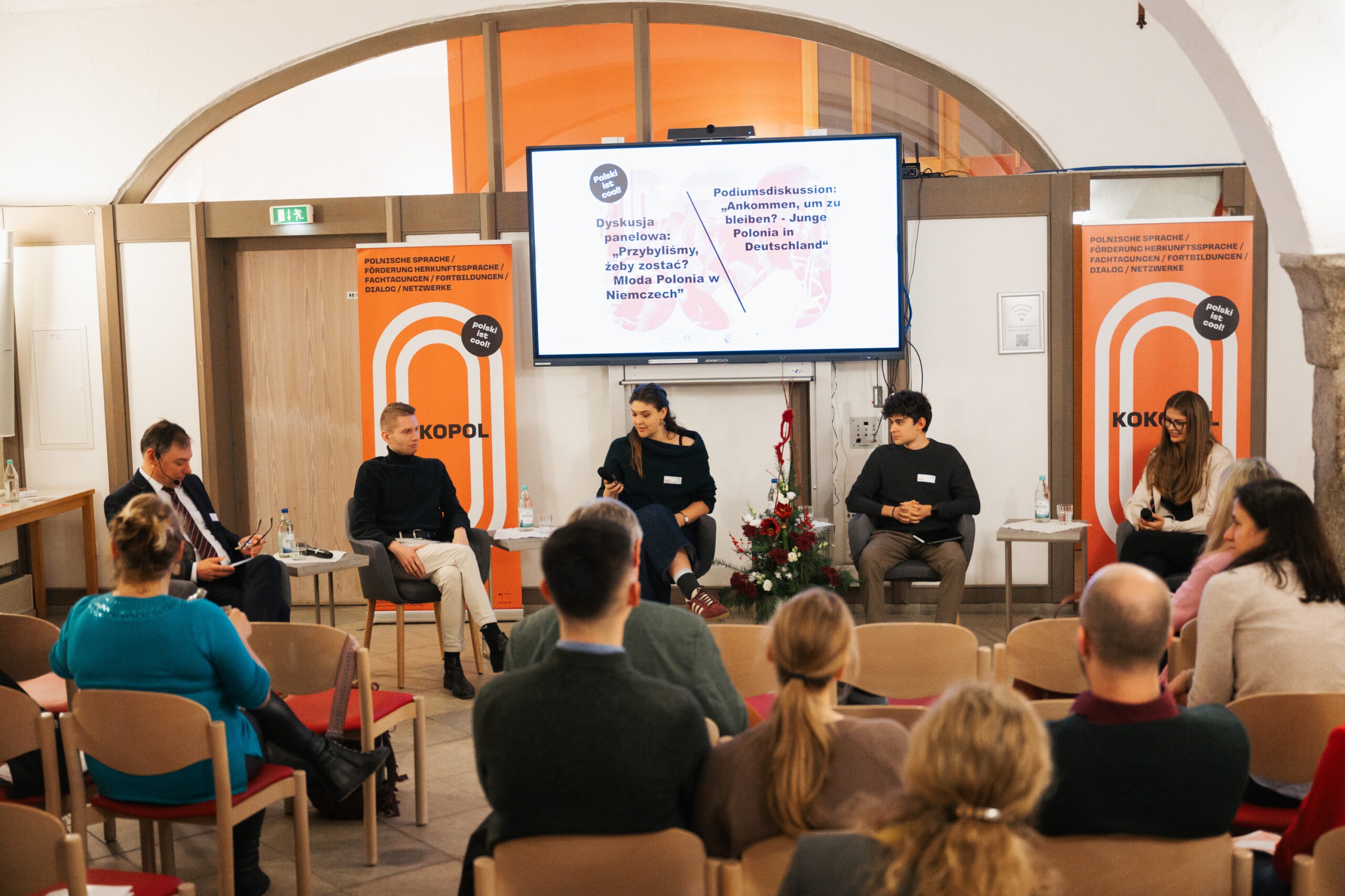 Wieczór należał do młodego pokolenia. W panelu dyskusyjnym pt. „Przyjechać, by zostać?”, prowadzonym przez dr. hab. Roberta Żurka (Fundacja Krzyżowa), studenci, działacze społeczni i animatorzy kultury rozmawiali o tożsamości, zaangażowaniu, relacjach europejskich oraz swoim miejscu w niemieckim społeczeństwie. Dyskusja miała niezwykle otwarty, żywy i osobisty charakter. Ukazała ona obraz Polonii, która nie tylko „odnalazła się” w Niemczech, ale chce aktywnie współdecydować o kształcie otaczającej ją rzeczywistości. W debacie udział wzięli: